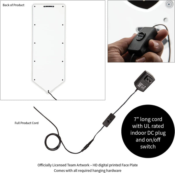Show off your team spirit with this Green Bay Packers Pennant LED Wall Decor. This LED wall decor is shaped like a pennant and features the official team colors and logo in an HD digitally printed design. Plug-in cord is 86" long. Made of aluminum and acrylic in an ultra-thin build, this pieces is for indoor use only. It boasts a fully backlighted faceplate with full 360 degree edge lighting for an immersive glowing experience. Installation is easy, as this wall decor can be easily mounted in your office, man cave, and more. Includes wall plug-in with on/off switch, sawtooth wall hanger, drywall anchor, and screw.