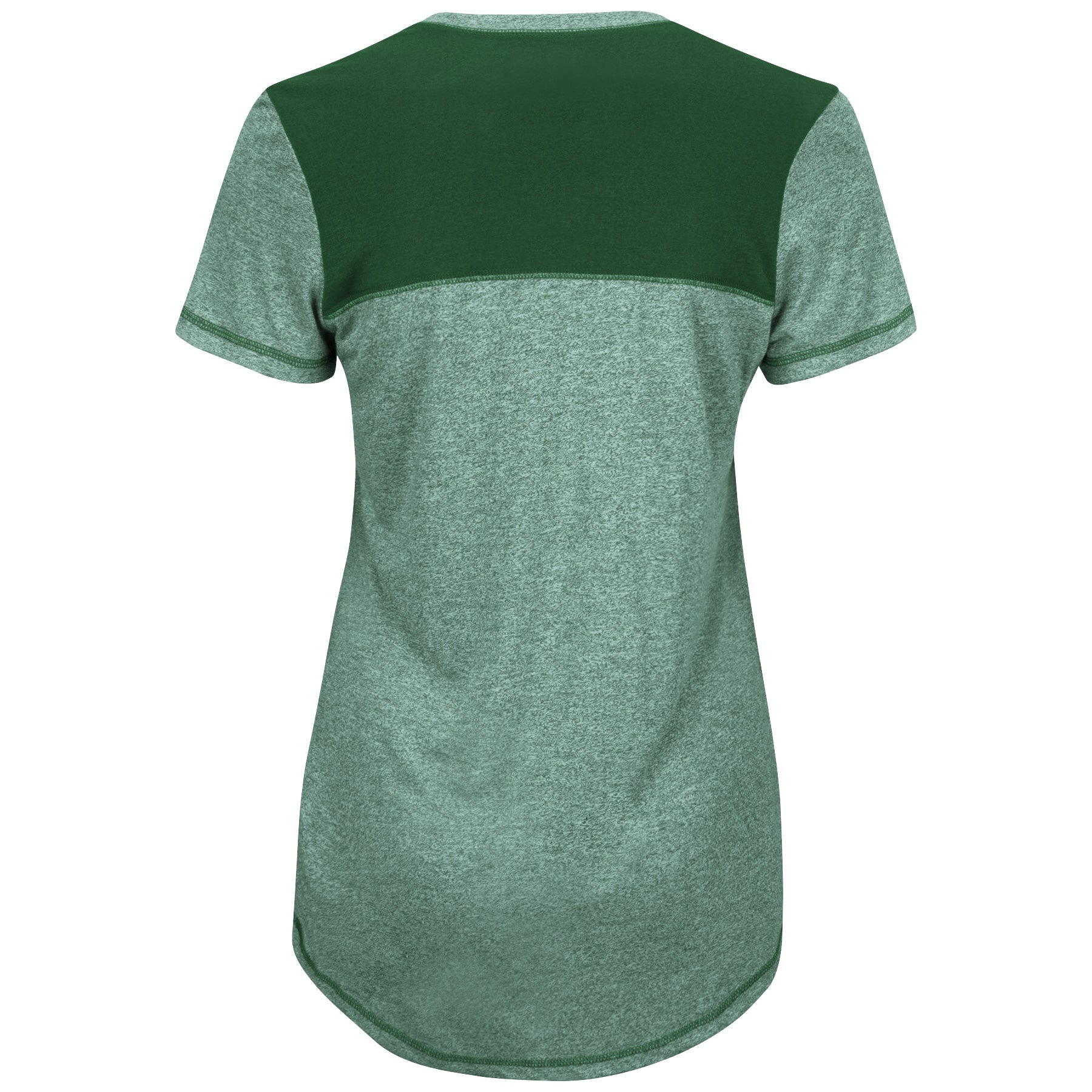 Officially licensed women's shirt by Majestic. 50% polyester/50% rayon with a shiny gold screenprinted team logo. Standard women's sizes.